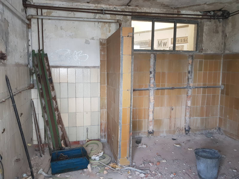 Links neben der Trennwand erkennt man, dass sich dort einmal ein Durchgang zum Lokschuppen befunden hat. Diese Türöffnung haben wir wieder geöffnet und hineingemauerten Steine entfernt.