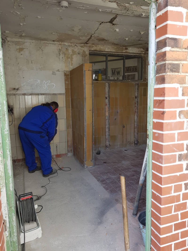 Am vergangenen Samstag wurde gleich an mehreren Projekten gleichzeitig gearbeitet. Beginnen wir mit den Arbeiten in der ehemaligen Toilettenanlage, die von außen an die Rückseite des Lokschuppen angebaut ist: Da eine Wieder-Inbetriebnahme für die Öffentlichkeit aufgrund fehlender Zu- und Abflüsse und schlechter Zuwegung ausgeschlossen war, haben wir beschlossen, die Räumlichkeiten zu entkernen und als Lager für Kleinteile umzubauen. Das ist mittelfristig sinnvoll, denn überall stehen Kisten und Kästen mit Schrauben, Muttern, Splinten und Dichtungen herum, die nun hoffentlich bald einen geordneten Platz finden.