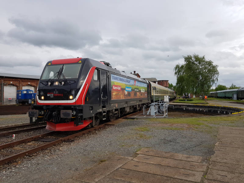 Am frühen Abend erhielten wir noch Besuch von der Firma „Erfurter Bahnservice“, die den Auftrag hat, eine Lokomotive unserer Nachbarn, der Eisenbahngesellschaft Potsdam, ins Eisenbahnmuseum nach Weimar zu bringen. Dazu war eine moderne Hybridlokomotive im Einsatz, die den Strom für ihre Fahrmotoren aus der Oberleitung oder aus einem eingebauten Generator zu beziehen. Mit von der Partie waren auch zwei Reisezugwagen, die für eine ausreichende Bremsleistung sorgen sollen, denn die Bremsen des zu überführenden Exponates sind nicht mehr funktionsfähig.