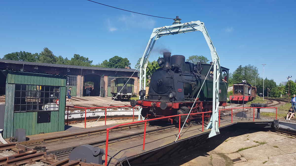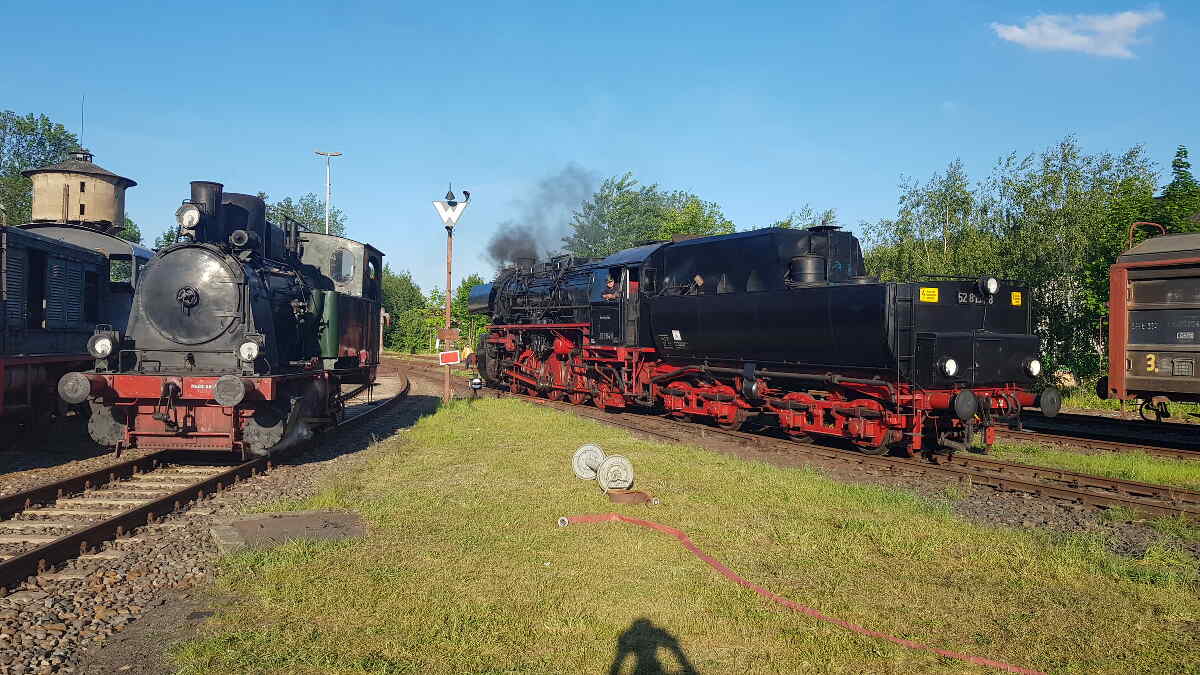 In the evening, our little one was allowed to spend the night in or in front of the Luckau engine shed. At times, she was accompanied by the Austrian steam locomotive 77.250, which is now operated by the Eurovapor association based in Würzburg.