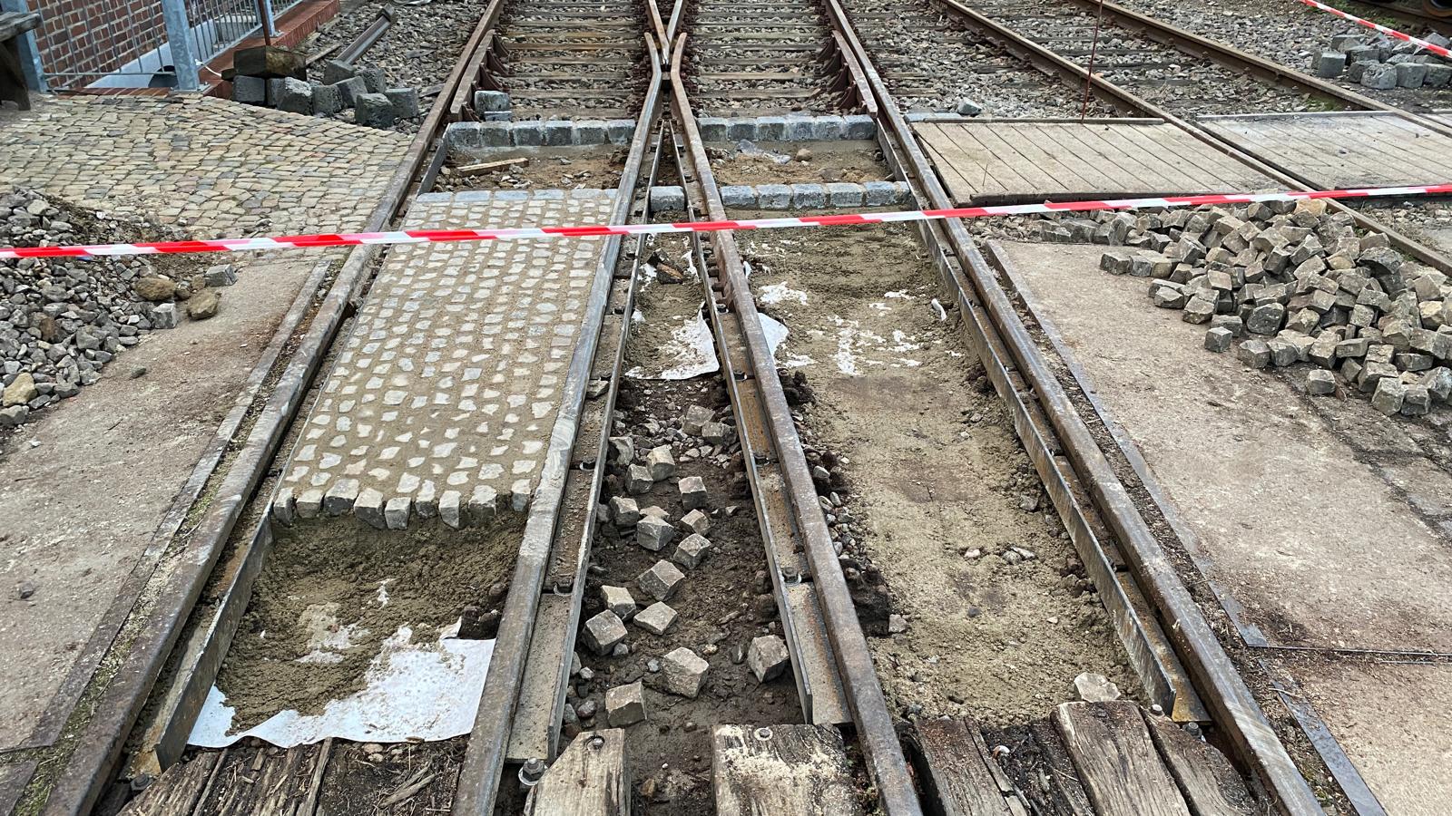 We are also currently working on our access road. If you have visited us before, you may remember the wooden planks that were fixed between the rails on the way from the gatehouse to the engine shed to ensure a crossing. These planks have now been worn out by heavy vehicles and need to be replaced. The new solution consists of paving the level crossings, which should be much more durable.