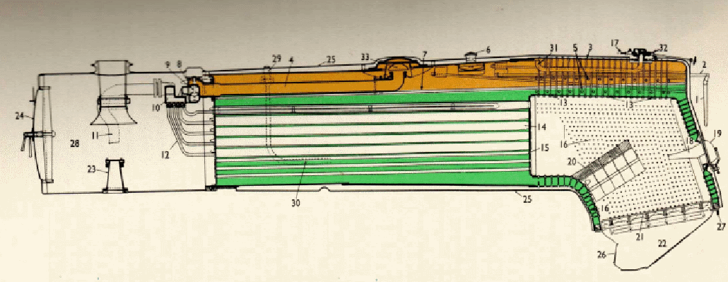 The following picture shows a sectional drawing of a boiler similar to the one on our steam locomotive 50 3570. The superheaters are marked with the numbers 12, the pipes in the boiler with the numbers 14 and 15, and the green colour indicates the space in the boiler where water is heated to steam when the locomotive is in operation. The space in which the steam collects above the water level is marked in orange. The smokebox (No. 28) is on the left-hand side of the drawing, the firebox (No. 16) on the right-hand side.