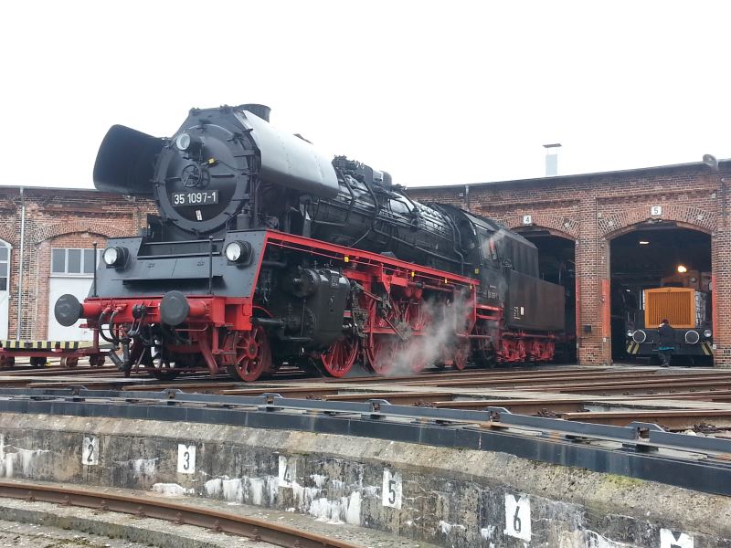 In the past few days, two steam locomotives have visited Wittenberge depot to take on coal and water and to berth some historic passenger coaches here for a few days when they were not in use between working railtours. On Monday, February 25, steam loco 03 2155 of the company WFL came to visit the premises of the historic locoshed to replenish her water supply and some three hours later, left the yard to steam off towards Berlin. She also left three passenger cars of type Bghw stabled here, which were to work a special train on March 2 from Hamburg to Wernigerode. These carriages were collected on March 1 by 35 1097 and our colleagues from Glauchau, and the empty coaches to Hamburg were piloted by diesel loco 118 770.