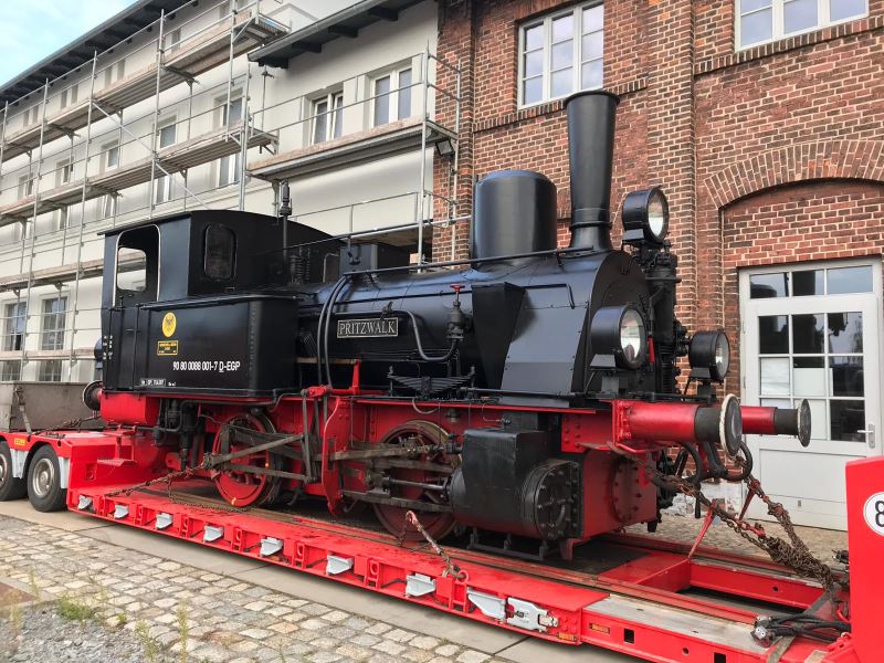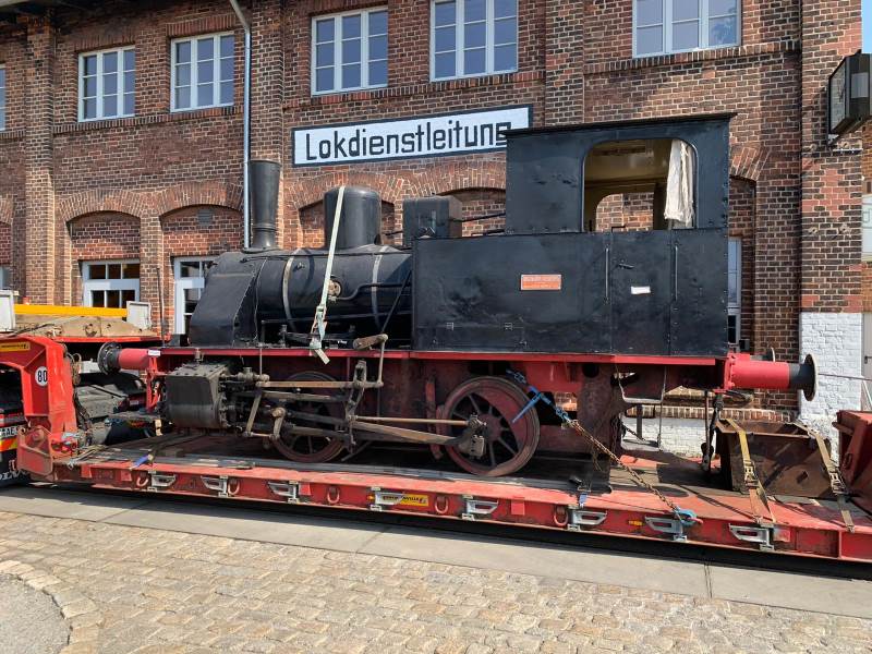 There was a rather unusual picture to be seen in Wittenberge today. When does a steam locomotive roll through the town? The mystery is quickly solved, because today the steam locomotive "Pritzwalk" was delivered by low-loader to the historical locomotive shed Wittenberge. The locomotive came piggyback from Meyenburg to take part in the museum's anniversary event on October 12 and 13, 2019. It will then be in steam and take turns with the museum's other locomotives in offering the popular driver's cab rides and will certainly also be given a place of honour in the vehicle parade, which will take place around 2 p.m. on the days of the event. The small locomotive was built in 1912 by Henschel in Kassel as a shunting locomotive for a gasworks in Frankfurt. It was in service there until 1968 and was then displayed for decades as a monument, most recently in front of a model railway shop in Wuppertal. In 1999, it was acquired by the Prignitzer Eisenbahn, forerunner of today's Eisenbahngesellschaft Potsdam, and was recently returned to working order. The club members are most pleased to have the locomotive as a guest on the occasion of the club's anniversary. The following pictures show the locomotive still on the special low-loader and after unloading under tow by a diesel locomotive on the turntable at the museum.