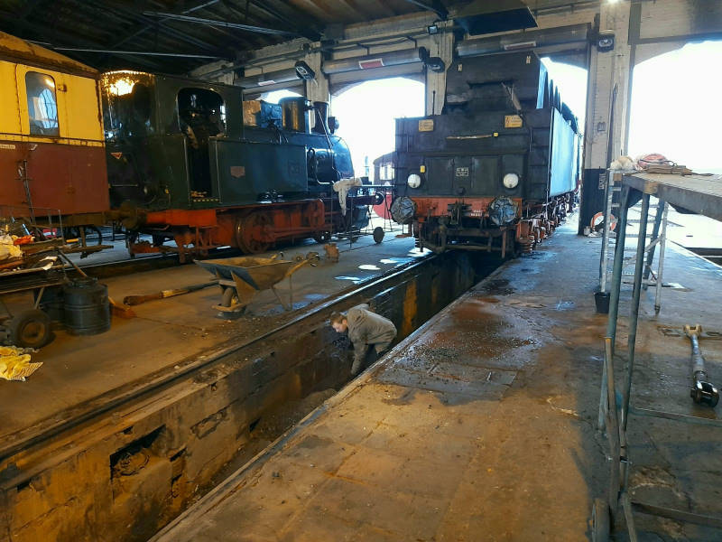 The small steam locomotives were placed on the examination pit under the open sky and slagged out. Afterwards the boilers were drained to avoid frost damage in winter.