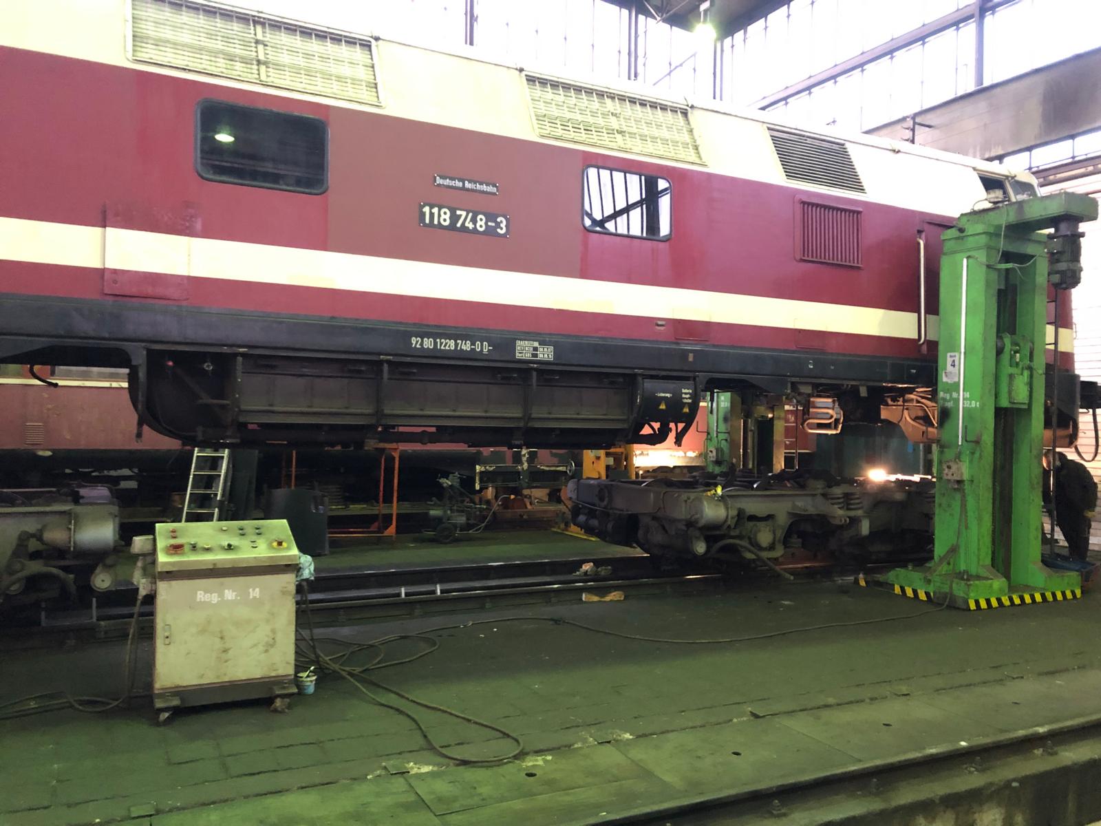 The biggest Christmas present for us is the operational refurbishment of diesel locomotive 118 748-3, which - as already reported - has been taken to a workshop in Klostermannsfeld for a general overhaul. The work here is making great progress. Some time ago, the locomotive was manoeuvred into the workshop in order to lift the locomotive body off the bogies. First of all, the bogies, including the axles and brake parts installed in them, will undergo a thorough inspection and refurbishment so that they can run smoothly in the coming years. You can already look forward with us to the moment when the locomotive is running under its own power again and can be used on the German railway network!
