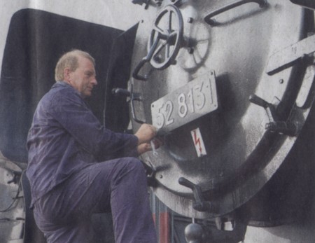 Reinald Franz versah die einst von Salzwedel nach Nossen verkaufte Lok mit einem neuen Schild. |