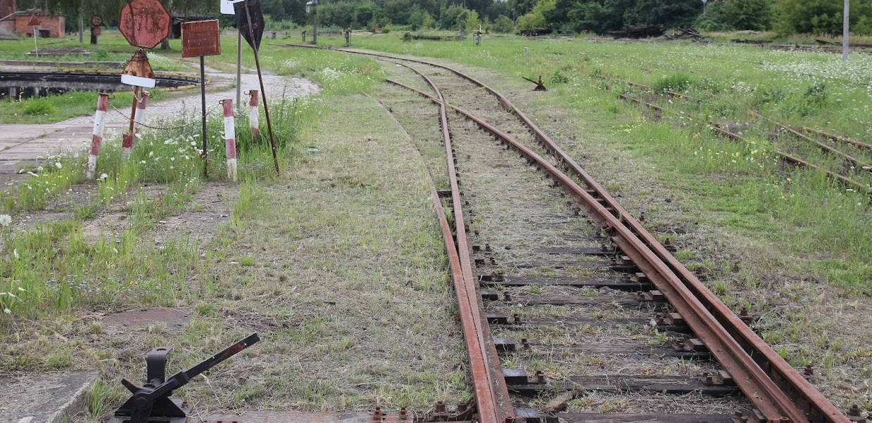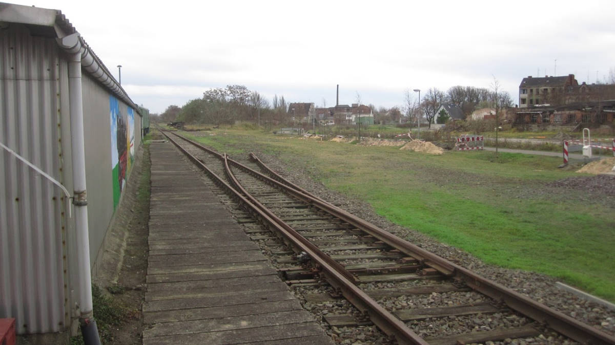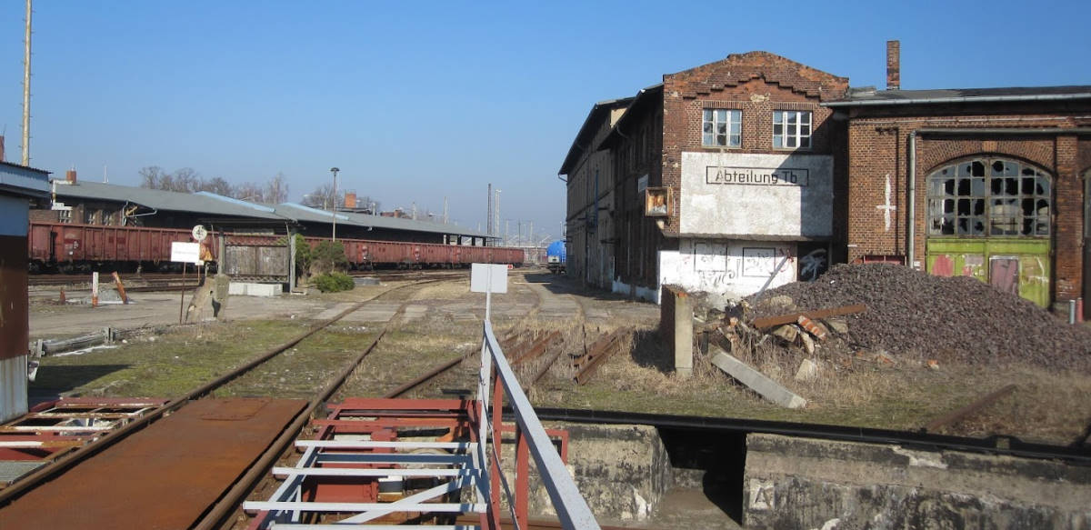 View of the former Magdeburg side of the station. This is where the trains went to and from the south until 1999. Today, our driver's cab rides take place here. A track-laying machine is also on display. The wasteland next to it has recently been revitalised by a road and a shopping centre.